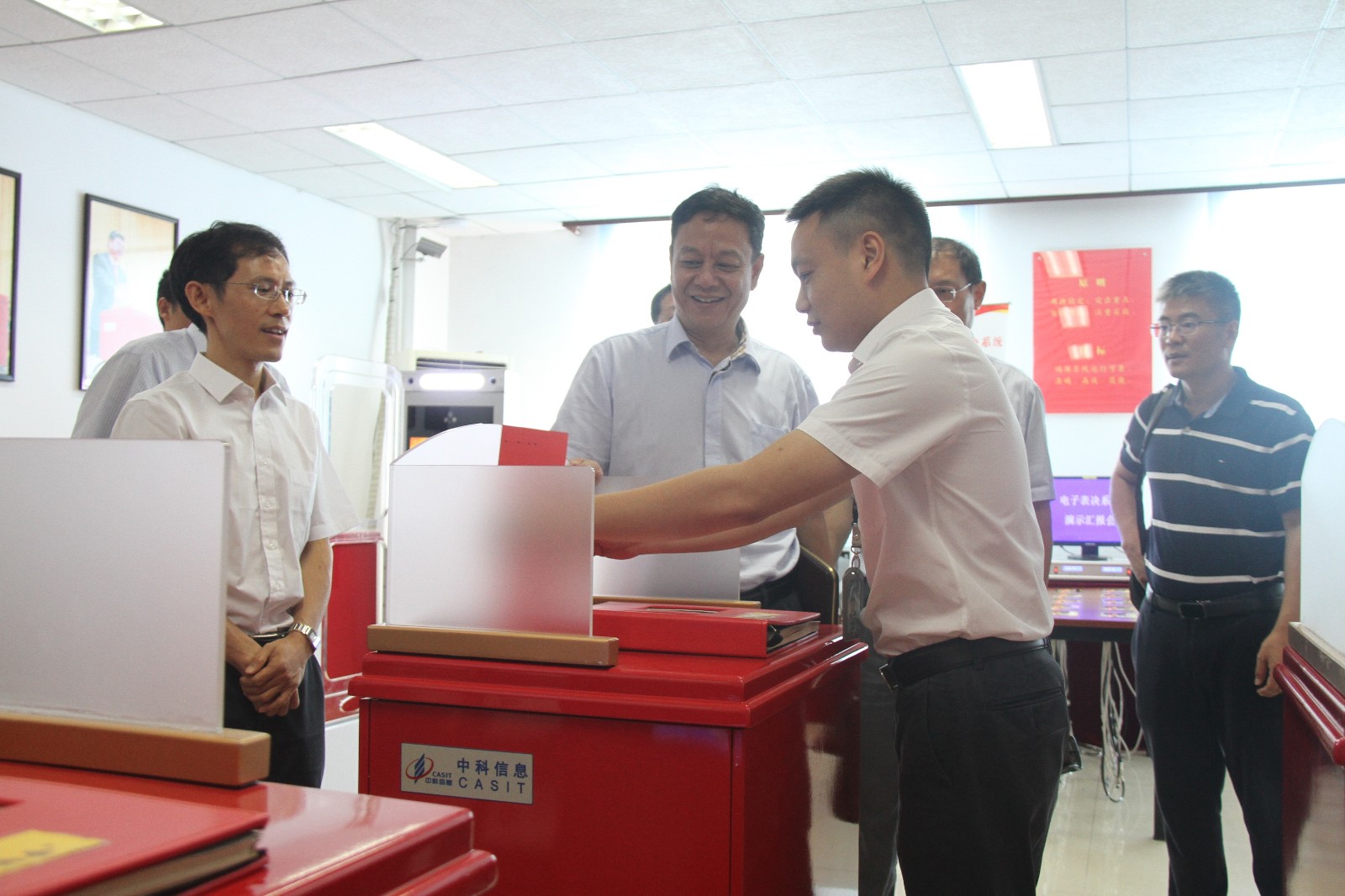在中科信息數字會議系統展廳,鄧勇副秘書長參觀了為歷屆黨代會和全國“兩會”會議選舉服務的電子票箱、人民大會堂使用的電子表決器、面向國內基層選舉市場研發的新產品—計票通設備和海外電子選舉系統設備,并了解了中科信息數字會議系統研發歷程,以及新型電子選舉系統和電子表決系統在黨的“十九大”和十三屆全國“兩會”上的使用情況。