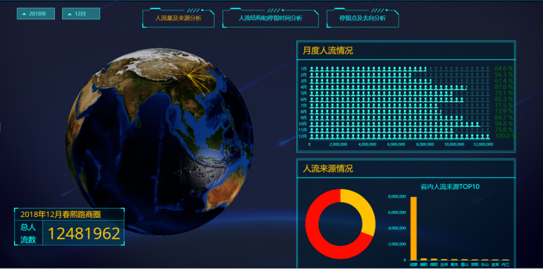 運用人口數據對區域內商圈進行人流量、來源、人流結構、停留點和停留時間等分析展示,監測宏觀經濟和微觀經濟的發展趨勢與活力,從而助力產業創新、經濟發展。