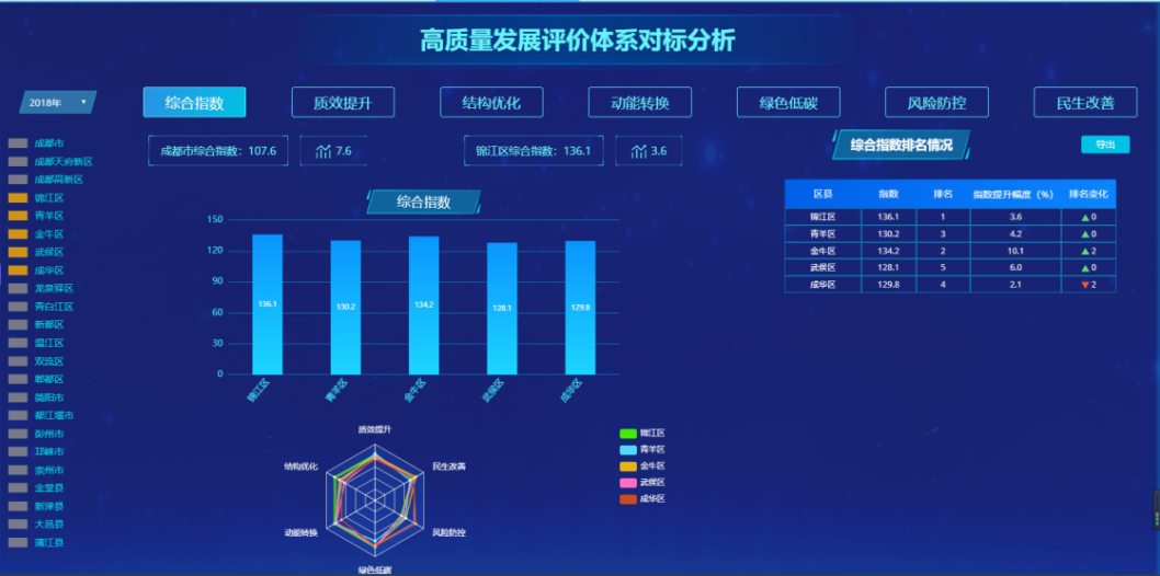 主要對區域內主導產業、高質量指標評價體系進行分析。按照產業、行業和樓宇劃分統計對象,整合經普數據、“四上企業”數據形成主導產業信息庫和樓宇經濟,并從質效提升、結構優化、動能轉換、綠色低碳、風險防控、民生改善六個維度對地方高質量發展指標評價體系分析展示,對區域內產業結構、資源載體、高質量發展定量分析與判斷。