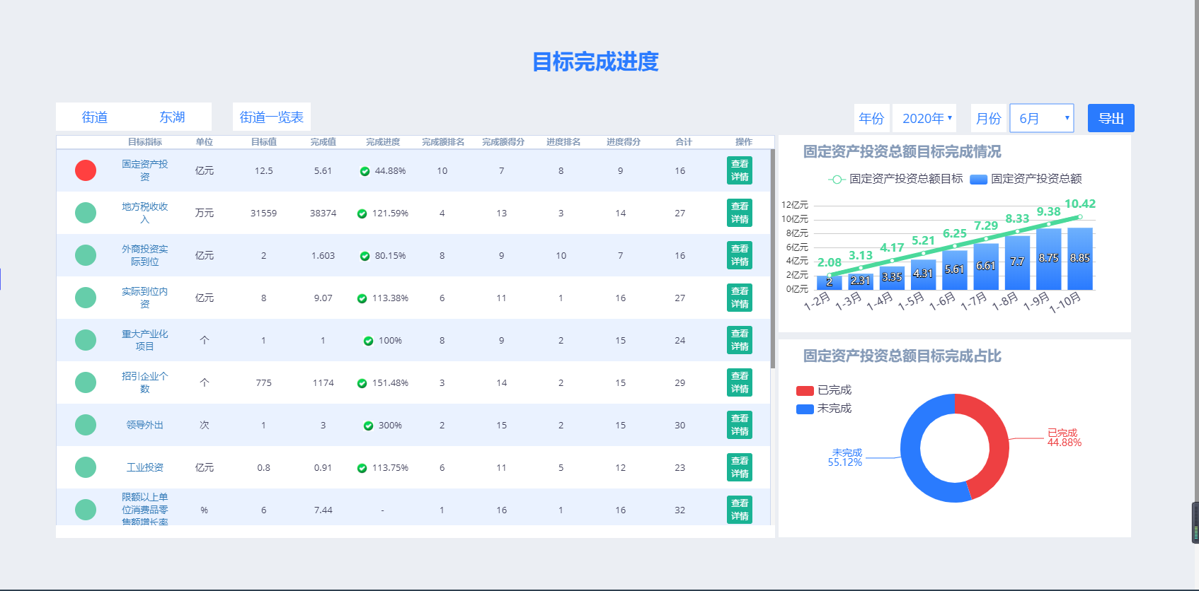 結合政府工作目標,分解重點監測指標,并運用多種指標展示方法,從考核指標,重點經濟指標等方面直觀呈現當前報告期內經濟運行指標達標情況,并對未達預期指標任務自動進行督辦信息推送,以便黨委政府及時進行經濟決策及工作部署。